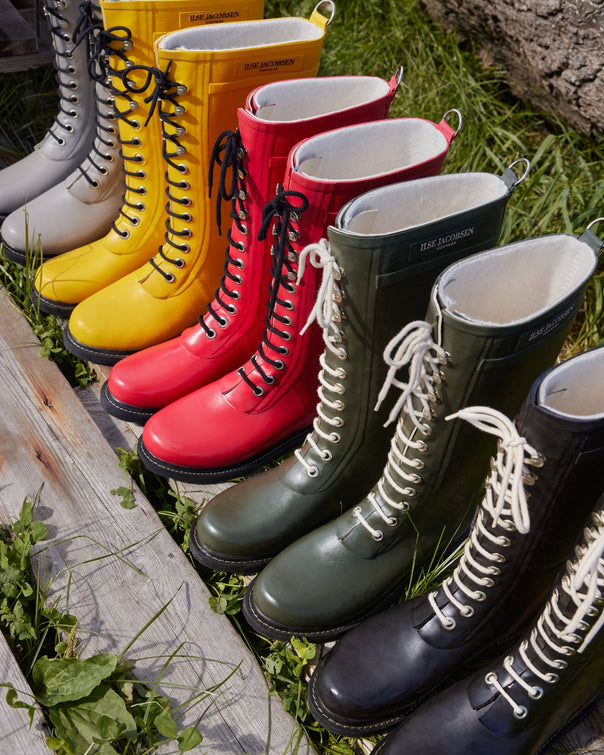 La cartera de productos de ILSE JACOBSEN HORNBÆK se caracteriza por ropa impermeable, vestidos, zapatos, accesorios y una serie de belleza exclusiva y, por supuesto, nuestras icónicas botas de goma.